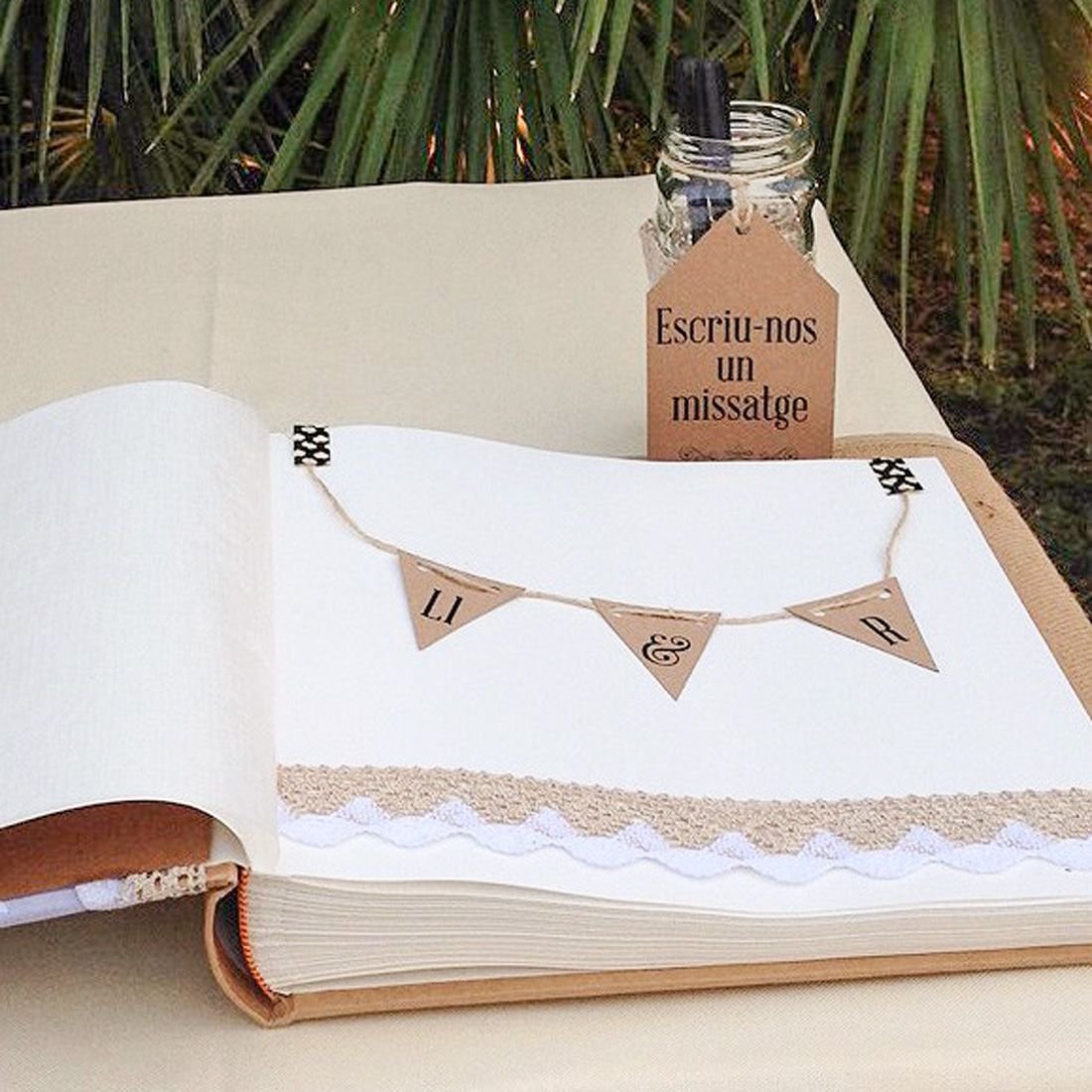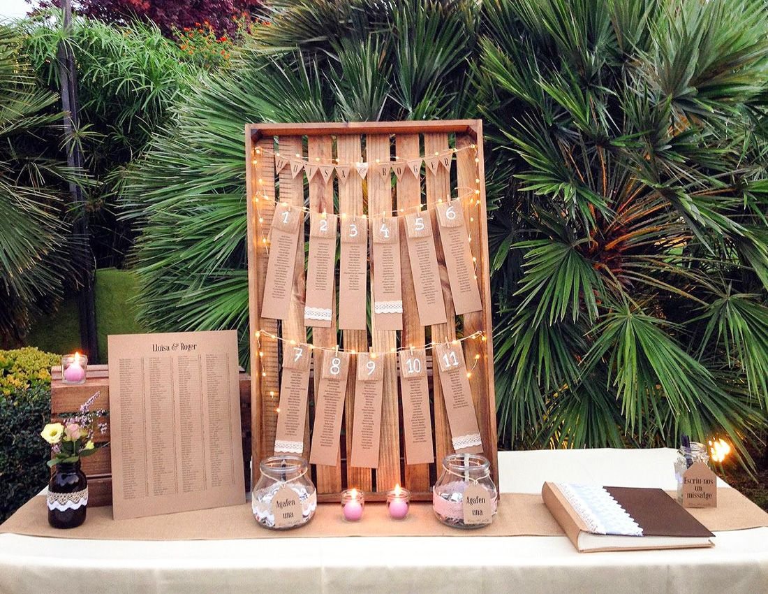 Seating plan realizada con una caja de madera de grandes dimensiones, cartulinas de papel kraft, rafia y guirnaldas de micro Led con el libro de firmas a juego.