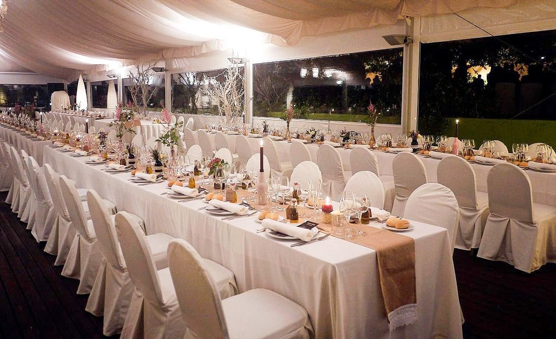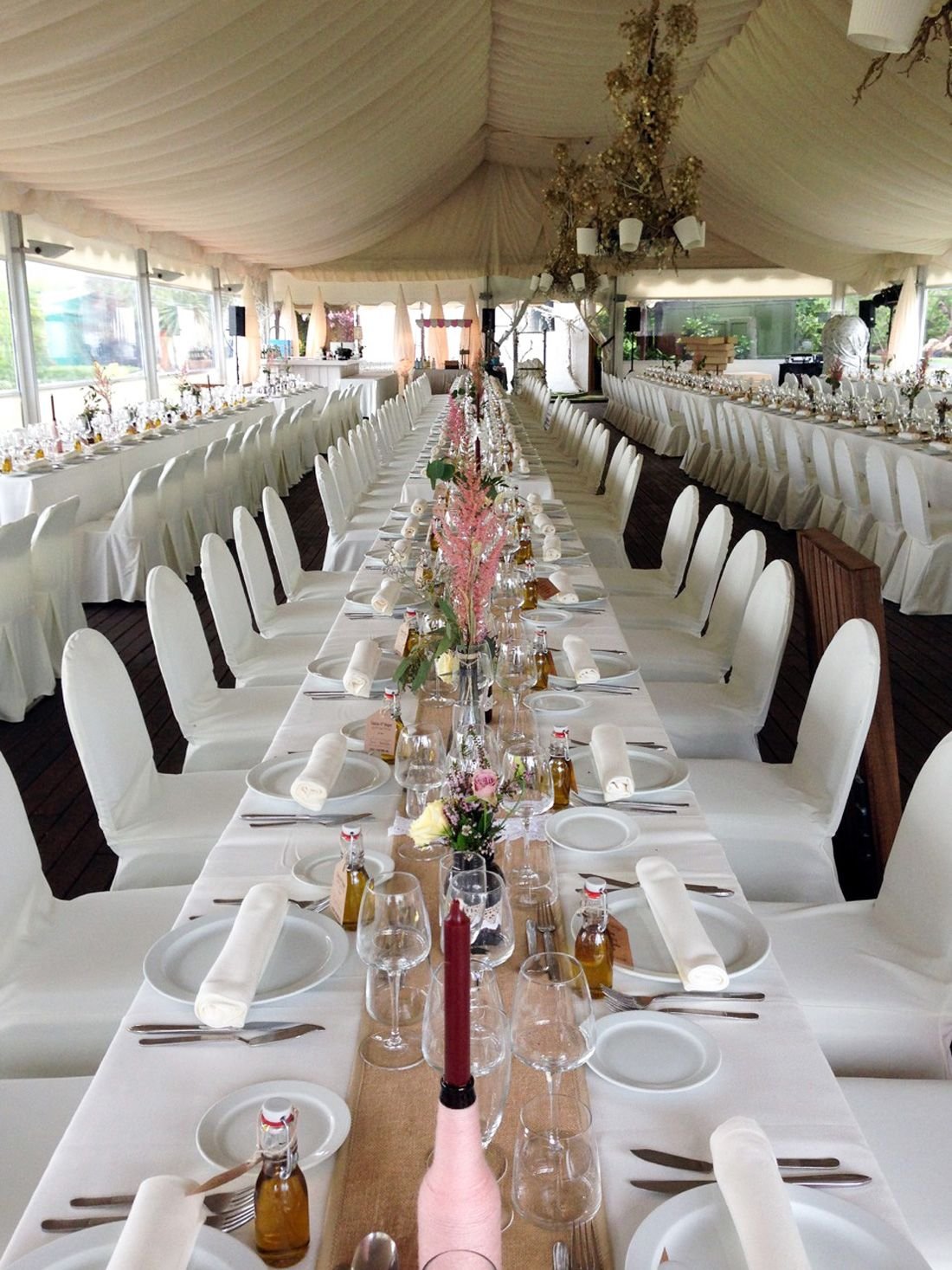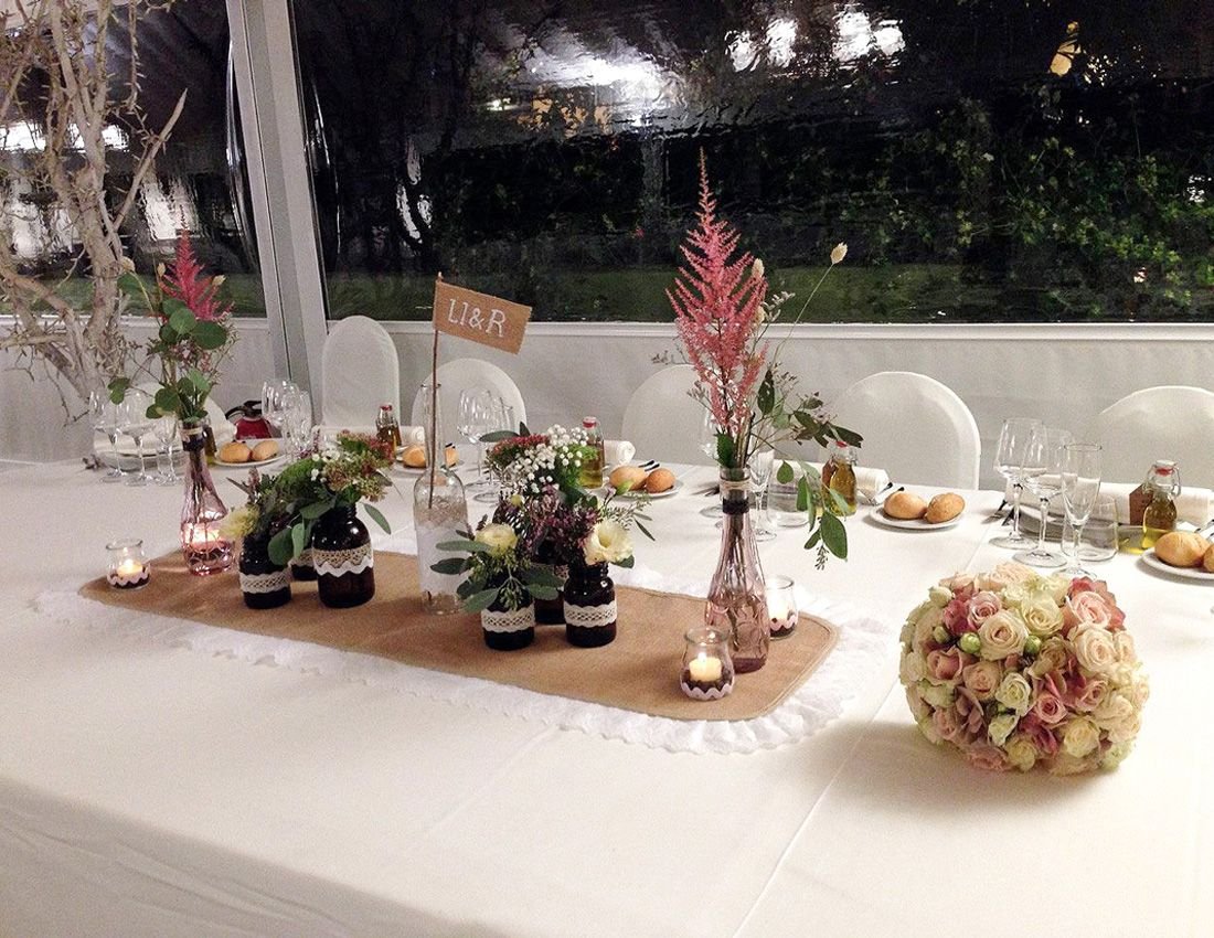 Montaje del banquete con mesas rectangulares decoradas con caminos de mesa realizados a medida con rafia y puntas de algodón blancas, botellas de vidrio con flores y velas.